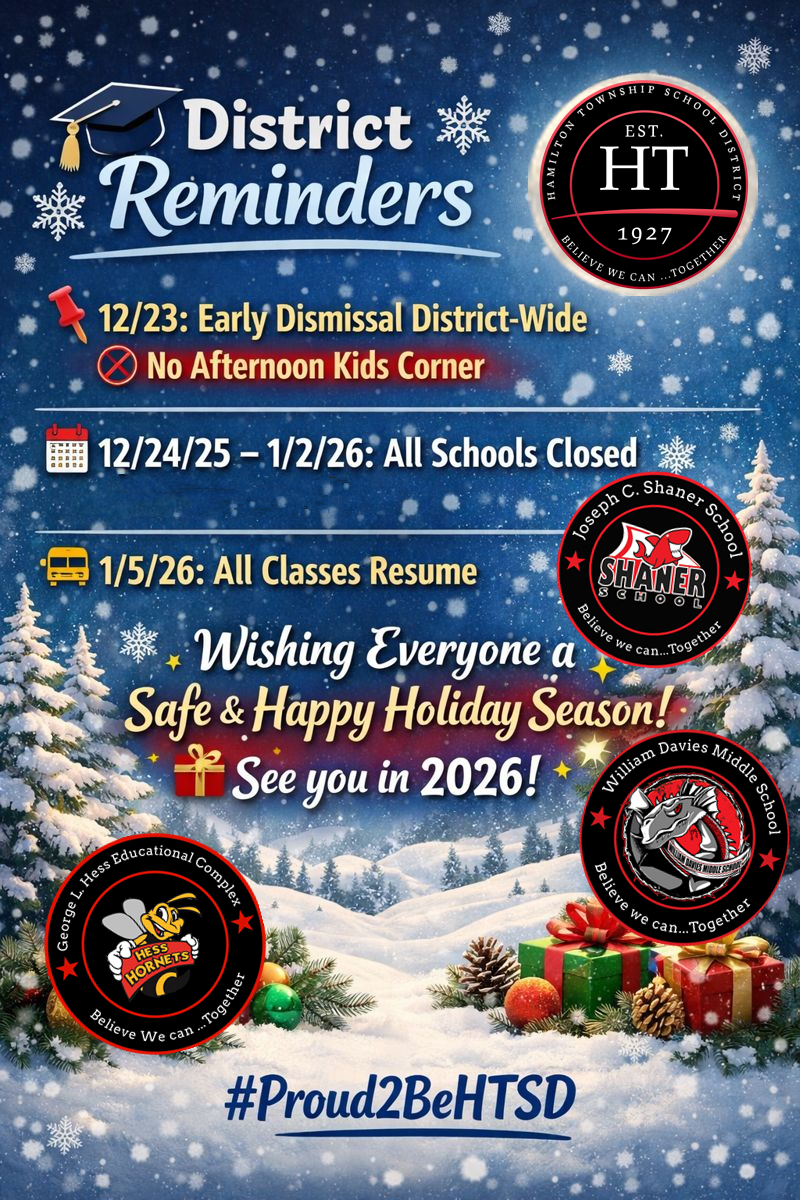 The Hamilton Township School District is dedicated to creating a safe, secure, and welcoming educational environment for all. We will inspire our diverse community to realize their optimal potential as lifelong learners and responsible members of our community.