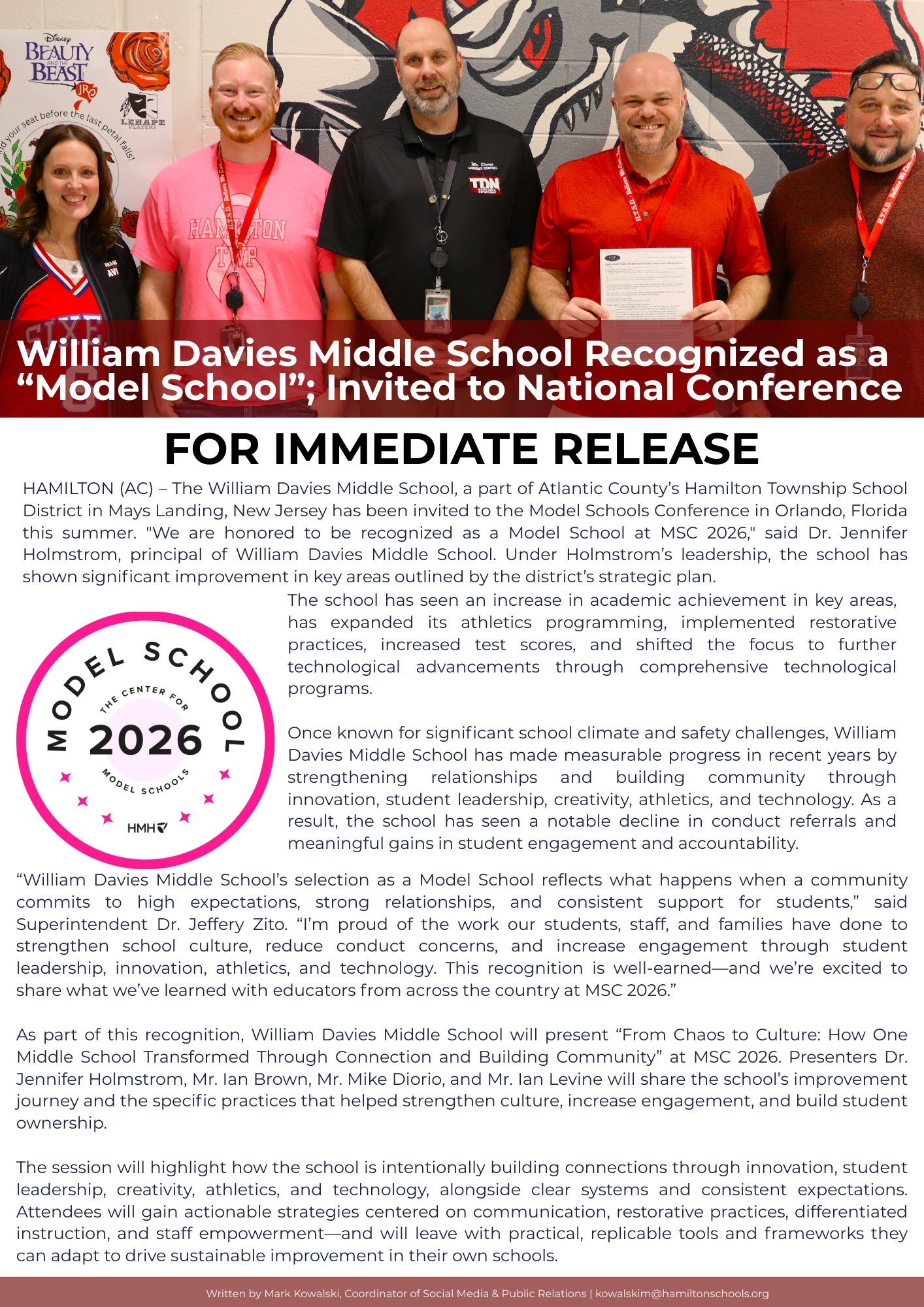 The Hamilton Township School District is dedicated to creating a safe, secure, and welcoming educational environment for all. We will inspire our diverse community to realize their optimal potential as lifelong learners and responsible members of our community.